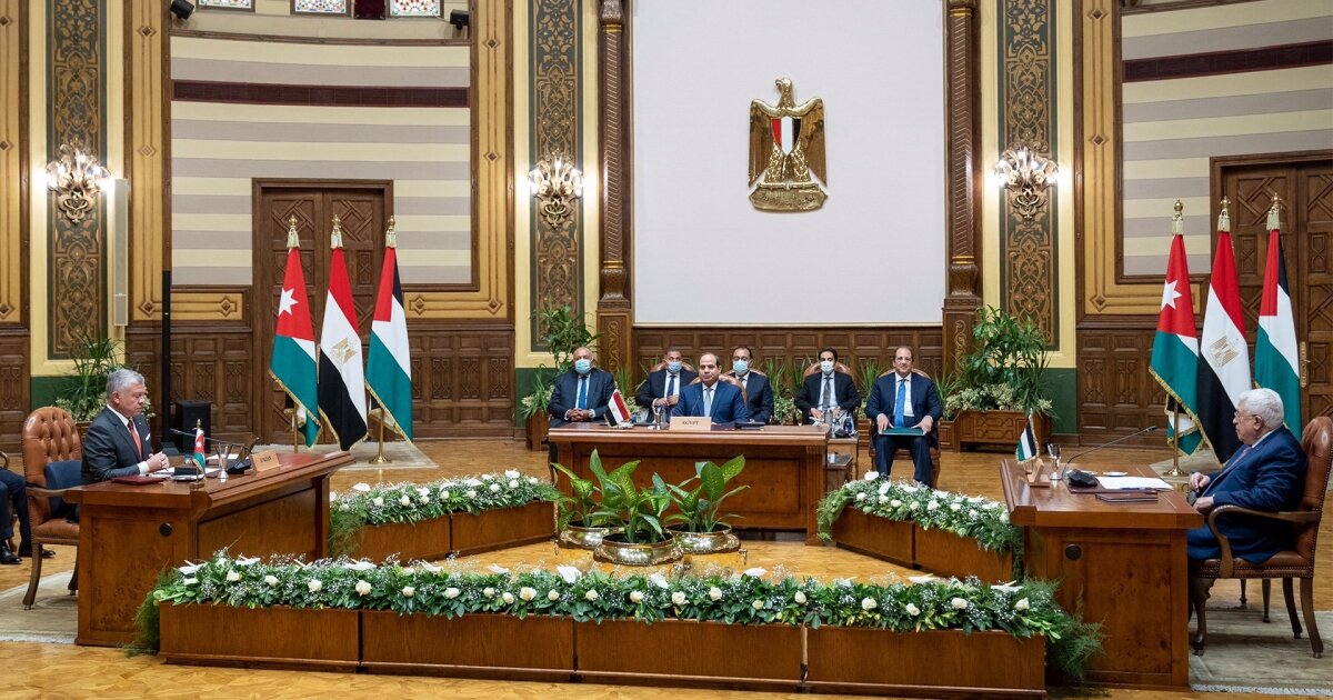 أكد البيان الختامى الصادر عن القمة الثلاثية التي جمعت الرئيس المصري عبد الفتاح السيسي والملك الأردني عبد الله الثاني والرئيس الفلسطيني محمود عباس على ضرورة العمل على تكثيف الجهود لحل الصراع على أساس حل الدولتين وتكثيف الجهود الرامية لاستئناف المفاوضات والعمل على إحياء عملية السلام وفق المرجعيات المعتمدة.