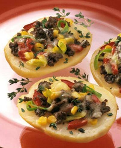تقطع حبات البطاطا الى انصاف وتفرغ من الداخل مع الابقاء على جدار بسماكة 55سم تقريبا. ثم توضع البطاطا على صينية الشواء وتطلى من الداخل بقليل من الزيت، ثم تشوى في فرن حار لمدة 10 دقائق.