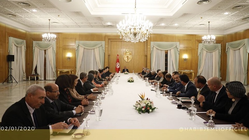 على إثر الندوة الصحفية المخصصة لإعلان تركيبة الحكومة امس الخميس عقد الحبيب جملي بدار الضيافة بقرطاج جلسة عمل مع كامل أعضاء الحكومة المقترحين لتقديمهم والتعارف بينهم، وقد تم التأكيد من طرف رئيس الحكومة المكلف على أهمية التحديات المطروحة أمامهم في الجانب الإقتصادي والإجتماعي وضرورة عمل الأعضاء كفريق واحد متآزر هدفه رفع التحديات وتجسيم تطلعات الشعب التونسي، وفق ما جاء في الصفحة الرسمية الفيسبوك لرئيس الحكومة المكلف الحبيب الجملي .