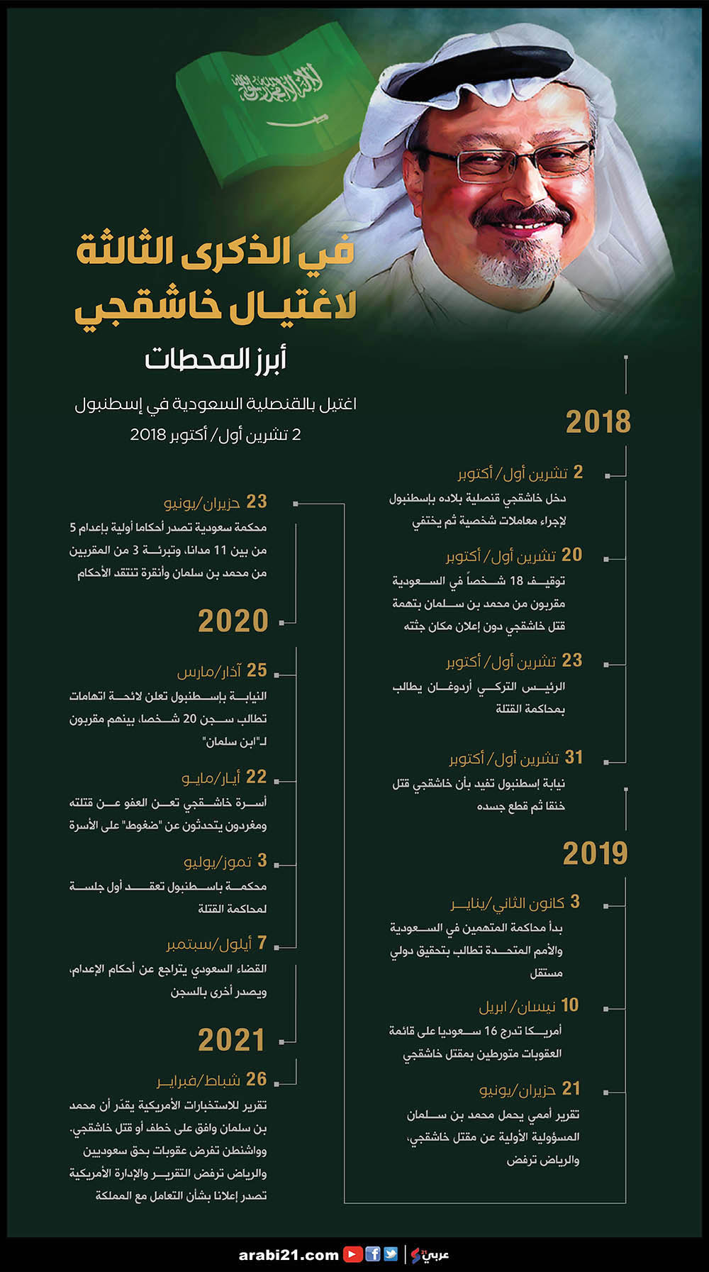 في الإنفوغراف أدناه نستذكر أبرز المحطات في قضية مقتل الصحفي خاشقجي: