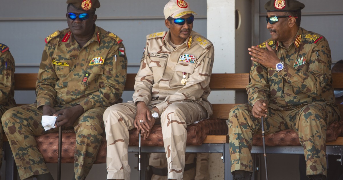رئيس مجلس السيادة عبد الفتاح البرهان (يمين) ونائبه محمد حمدان دقلو (وسط) خلال مشاركتهما في فعالية بالخرطوم (الأناضول)