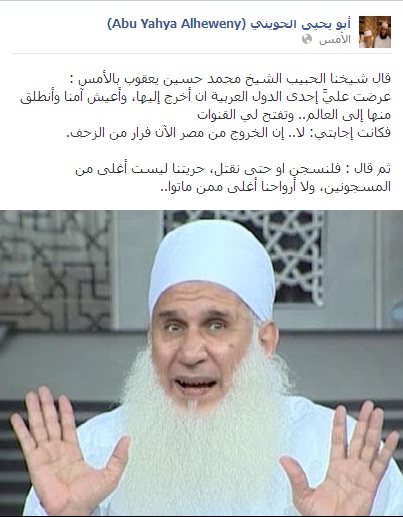 فقد نشر ابن الشيخ أبي إسحاق الحويني، في صفحته على “الفيسبوك”، أمس الأربعاء: قال شيخنا الحبيب الشيخ محمد حسين يعقوب :”عرضت عليَّ إحدى الدول العربية أن أخرج إليها، وأعيش آمنا وأنطلق منها إلى العالم.. وتفتح لي القنوات، فكانت إجابتي: لا.. إن الخروج من مصر اﻵن فرار من الزحف“.