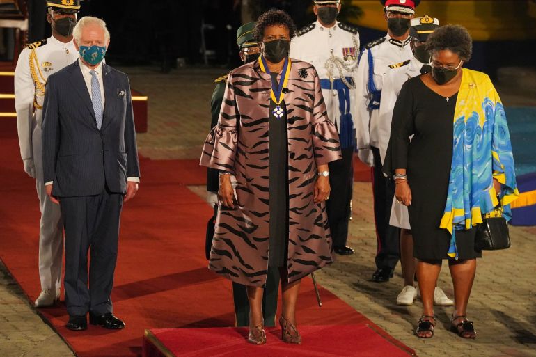 الأمير تشارلز رفقة رئيسة باربيدوس ساندرا ماسون (وسط) ورئيسة وزرائها ميا موتلي في احتفالية يوم 30 نوفمبر/تشرين الثاني 2021، قبيل انفصال الجزيرة رسميا عن حكم الملكة إليزابيث (غيتي إيميجز)