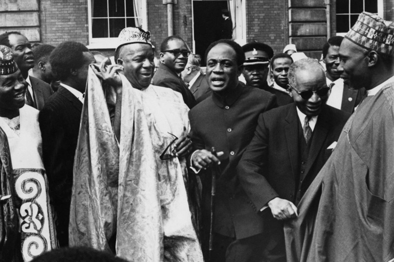 من اليسار إلى اليمين: السير ألبرت مارغاي رئيس وزراء سيراليون، وكوامي نكروما رئيس غانا، والدكتور هاستينغز باندا رئيس وزراء ملاوي، والسير أبو بكر تافاوا باليوا رئيس وزراء نيجيريا؛ في لندن لافتتاح المؤتمر السنوي لرؤساء وزراء دول الكومنولث