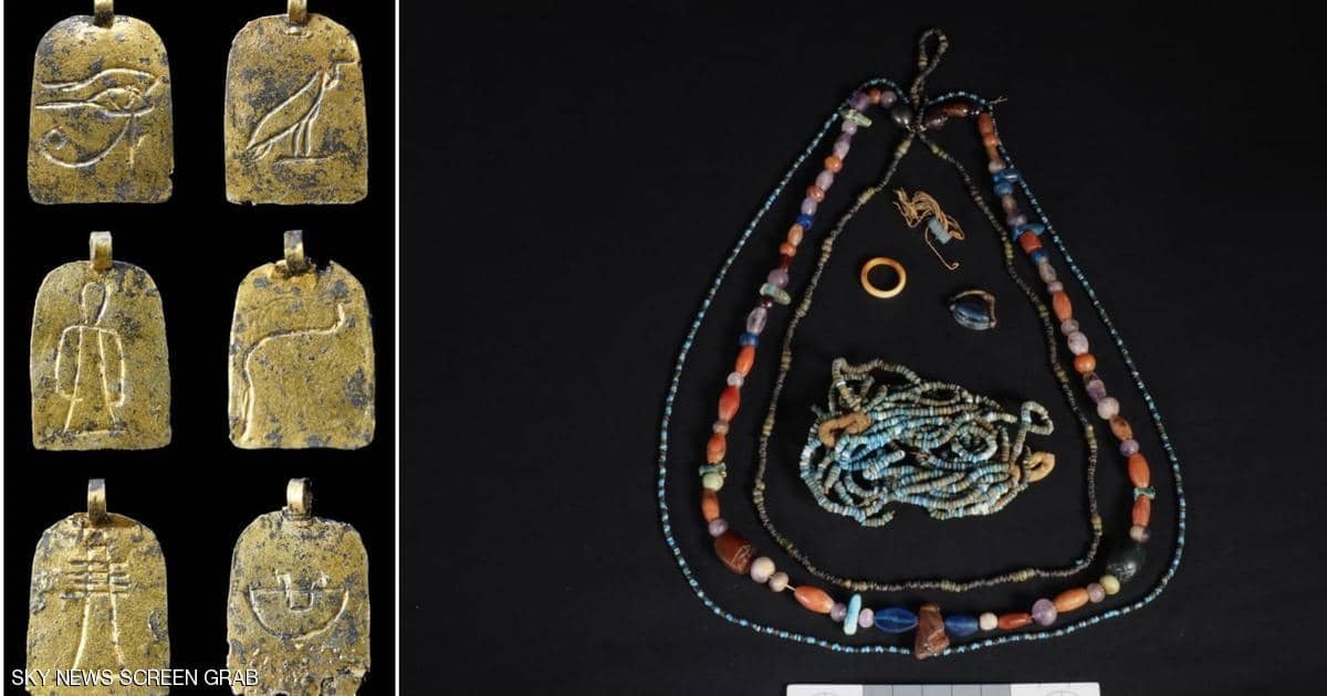 وأضاف  رئيس الإدارة المركزية لآثار مصر العليا، محمد عبد البديع، أن البعثة عثرت على 4 قلادات مربوطة ببعضها البعض بمشبك خزفي على صدر المومياء؛ القلادة الأولى يبلغ طولها 70 سم، وهي تتكون من خرز دائري مزخرف باللون الأزرق الداكن والفاتح.