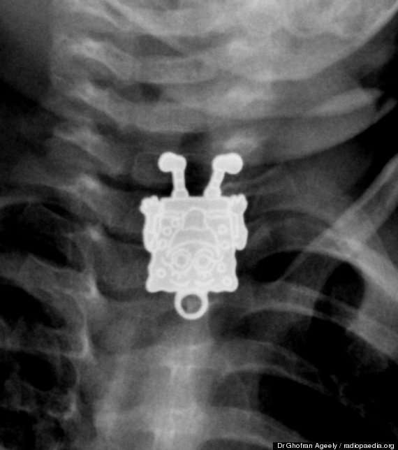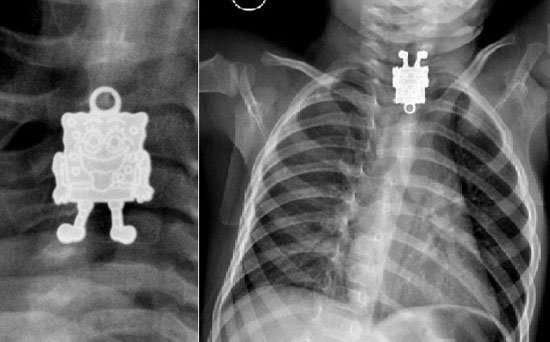 و نشرت إحدى أخصائيات الأشعة بمستشفى الملك عبدالعزيز صوراً للأشعة السينية ويظهر فيها سبونج بوب، مشيرة إلى أنها للوهلة الأولى بعد اطلاعها على الصورة الجانبية ظنت أن الطفل ابتلع قلماً، إلا أنها تفاجأت بعد ذلك من الصور الأمامية بأنها قلادة على شكل “سبونج بوب”.
