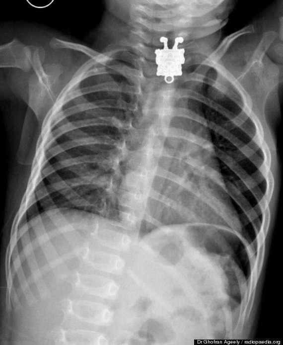 وأحضر أب طفلهُ الرضيع إلى المستشفى، مخبراً عن أنه ابتلع قطعة غير معروفة، وبإجراء الأشعة فوجئ الأطباء بوجود بوجه سبونج بوب يبتسم لهم في الاشعة السينية ما أصابهم للوهلة الأولي بالدهشة.