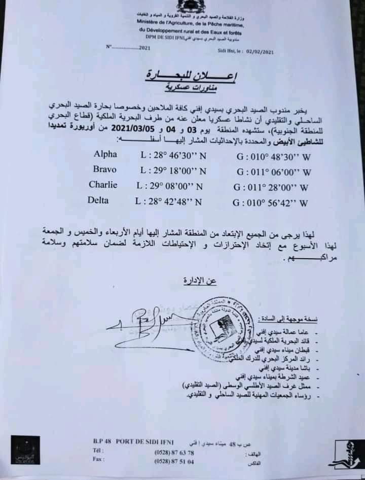 تلقى صيادة وملاحي الصيد البحري بمنطقة سيدي افني، تحذيرا من مندبية الصيد البحري بالاقليم، بعدم الاقتراب من المنطقة البحرية المحتضنة لتداريب المناورات العسكرية البحرية الأمريكية المغربية، طيلة أيام 3 و4 و5 مارس الجاري.