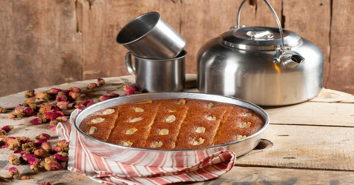 4- ادهني صينية فرن بالقليل من الزيت واسكبي نصف مزيج البسبوسة ثمّ ضعي القشدة فوقها وبعدها النصف المتبقّي من العجينة.
