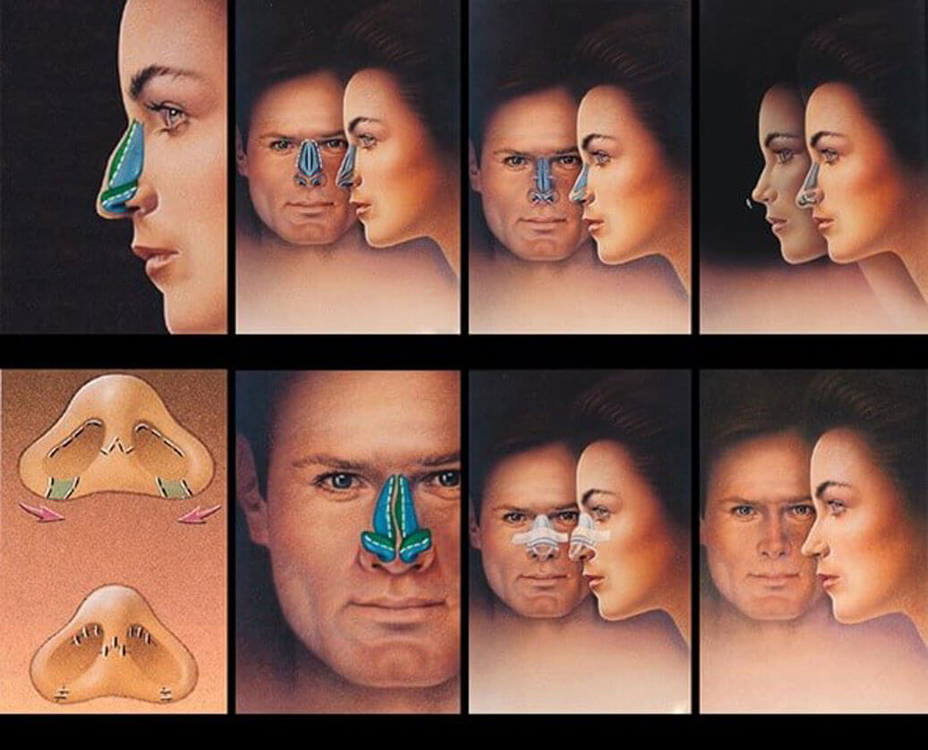 وكلها خطوات تبدأ بفتحة يحدثها الجراح بالمشرط داخل الأنف ويتسلل منها إلي ما تحت الجدل للوصول إلي هيكل الأنف العظمي والغضروفي حيث يتم العمل في الغضاريف بالطريقة التي يراها الجراح وصولاً إلي النتيجة التي بأملها من تصغير أو تكبير أو رفع أو تقصير في الغضاريف.