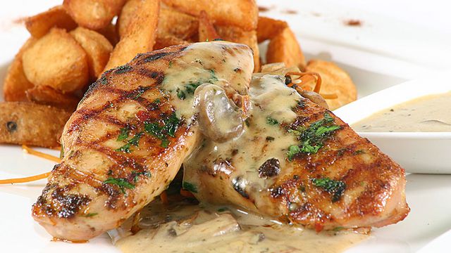 - في أطباق التقديم، نضع قطعة من صدر الدجاج المقلي ونصب مغرفة كبيرة من الصوص .