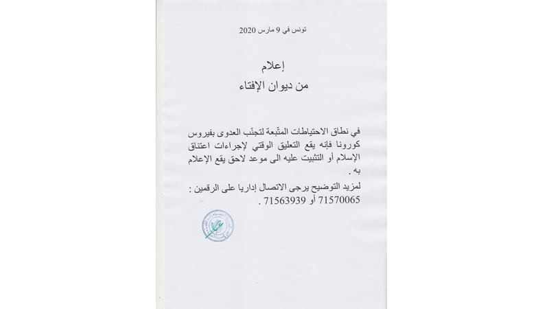 اعلن ديوان الافتاء في بلاغ له امس انه في نطاق الاحتياطات المتبعة لتجنب العدوى بفيروس كورونا تم التعليق الوقتي لإجراءات اعتناق الاسلام الى موعد لاحق سيقع الاعلام به.
