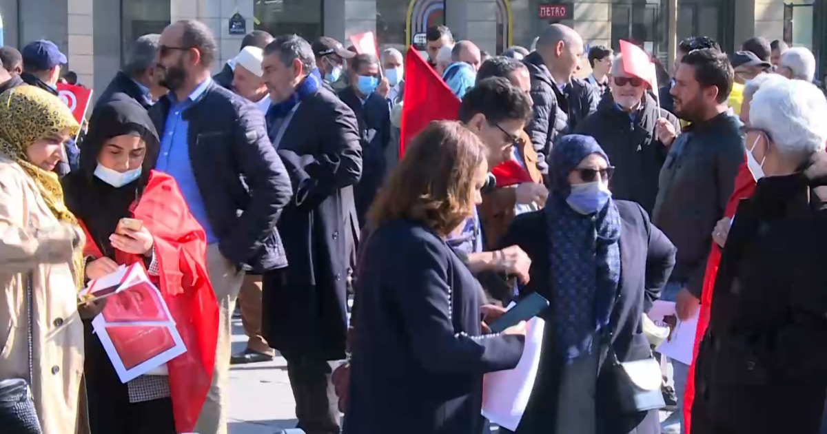 طالب متظاهرون تونسيون في باريس، الرئيس التونسي قيس سعيد بالتراجع عما وصفوه بالانقلاب على الدستور، بينما دعا الرئيس التونسي الأسبق المنصف المرزوقي، التونسيين للدفاع عن الديمقراطية.