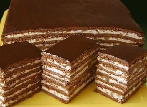 إزالة من الحرارة، ويضاف الدقيق والكاكاو ويعجن العجين، تخبز الكيكة كقالب واحد او عدة قوالب بسماكة 4 – 5 ملم