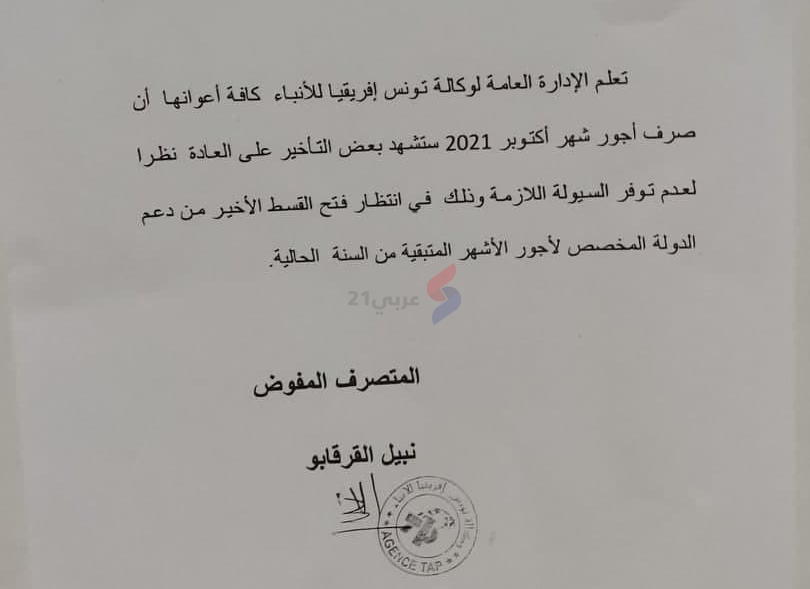 وأكد المصدر أن إدارة وكالة تونس أفريقيا للأنباء الحكومية أعلمت الصحفيين والموظفين العاملين بها شفويا بتأخير دفع رواتبهم بسبب عدم توفر السيولة اللازمة.