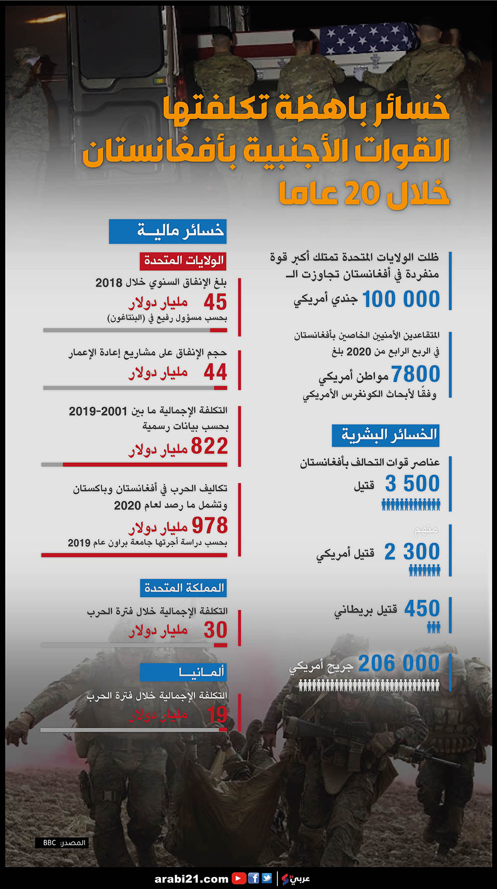 وها هي القوات الأجنبية تنسحب من أفغانستان، بعد احتلال دام 20 عاماً، بخسائر بشرية، وتكلفة مالية باهظة، نستعرضها في الإنفوغراف أدناه: