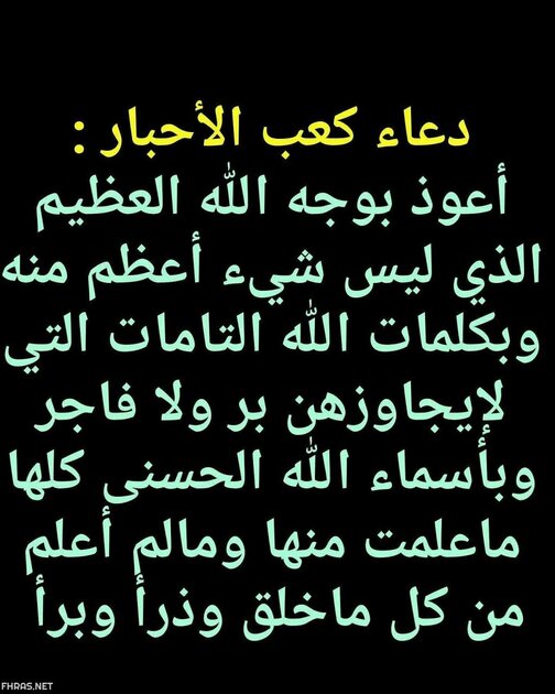 دعاء: ‘ﺃﻋﻮﺫ  ﺑﻮﺟﻪ ربنا ﺍﻟﻠﻪ ﺍﻟﻌﻈﻴﻢ ﺍﻟﺬﻱ ﻟﻴﺲهنالك  ﺷﻲﺀ ﺃﻋﻈﻢ ﻣﻨﻪ، واعوذ ﺑﻜﻠﻤﺎﺕ ﺍﻟﻠﻪ ربنا ﺍﻟﺘﺎﻣﺎﺕ ﺍﻟﻼ‌ﺗﻲ ﻻ‌ ﻳﺠﺎﻭﺯﻫﻦ الﺑﺮ ﻭﻻ‌ الﻓﺎﺟﺮ، ﻣﻦ الﺷﺮ ﻣﺎ ﻳﻨﺰﻝ ﻣﻦ ﺍﻟﺴﻤﺎﺀ، ﻭالﺷﺮ ﻣﺎ ﻳﻌﺮﺝ ﻓﻴﻬﺎ، ﻭالﺷﺮ ﻣﺎ ﺫﺭﺃ ﻓﻲ ﺍﻷ‌ﺭﺽ، ﻭالﺷﺮ ﻣﺎ ﻳﺨﺮﺝ ﻣﻨﻬﺎ، ﻭﻣﻦ الﻓﺘﻦ ﺍﻟﻠﻴﻞ ﻭﺍﻟﻨﻬﺎﺭ، ﻭﻣﻦ الﻃﻮﺍﺭﻕ ﺍﻟﻠﻴﻞ ﻭﺍﻟﻨﻬﺎﺭ، ﺇﻻ‌ الﻃﺎﺭﻗﺎ ﻳﻄﺮﻕ ﺑﺨﻴﺮ ﻳﺎ ﺭﺣﻤﻦ”.