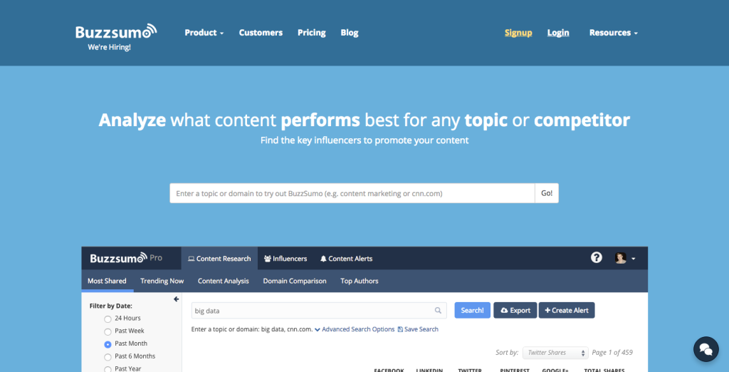 يُعَدُّ (Buzzsumo) مفيداً بشكلٍ خاص للقيام بعمليات بحث حول المواضيع المثيرة للاهتمام ورؤية أنواع المحتوى التي تروق للجمهور مع كل واحد من تلك المواضيع، ولكنَّه يمكن أن يُستخدَم كذلك لتحليل المحتوى الخاص بك.