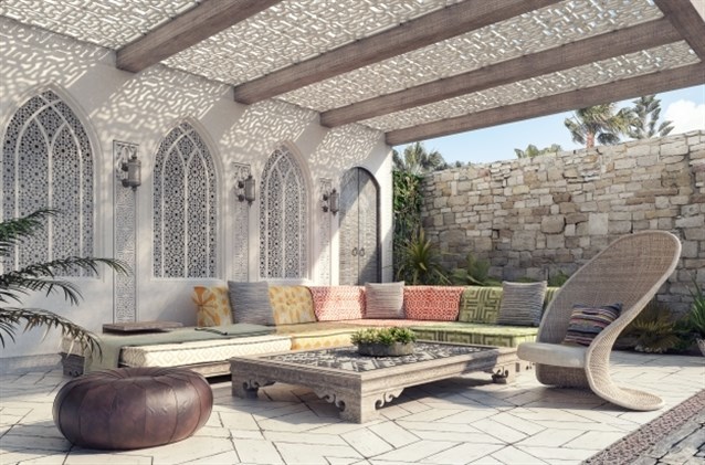 يبدو هذا الديكور مناسباً تماماً للجلسات والباحات الخارجيّة الواسعة ويسهل تطبيقه عبر توزيع المقاعد الخشبية البيضاء ذات التصميم الشرقي مع الوسادات بخاماتها وألوانها الزاهية والمتناسقة، طاولات النحاس الدائرية والشلحات البيضاء النتدلية والتي تضفي حيوية ملحوظة إلى الديكور.