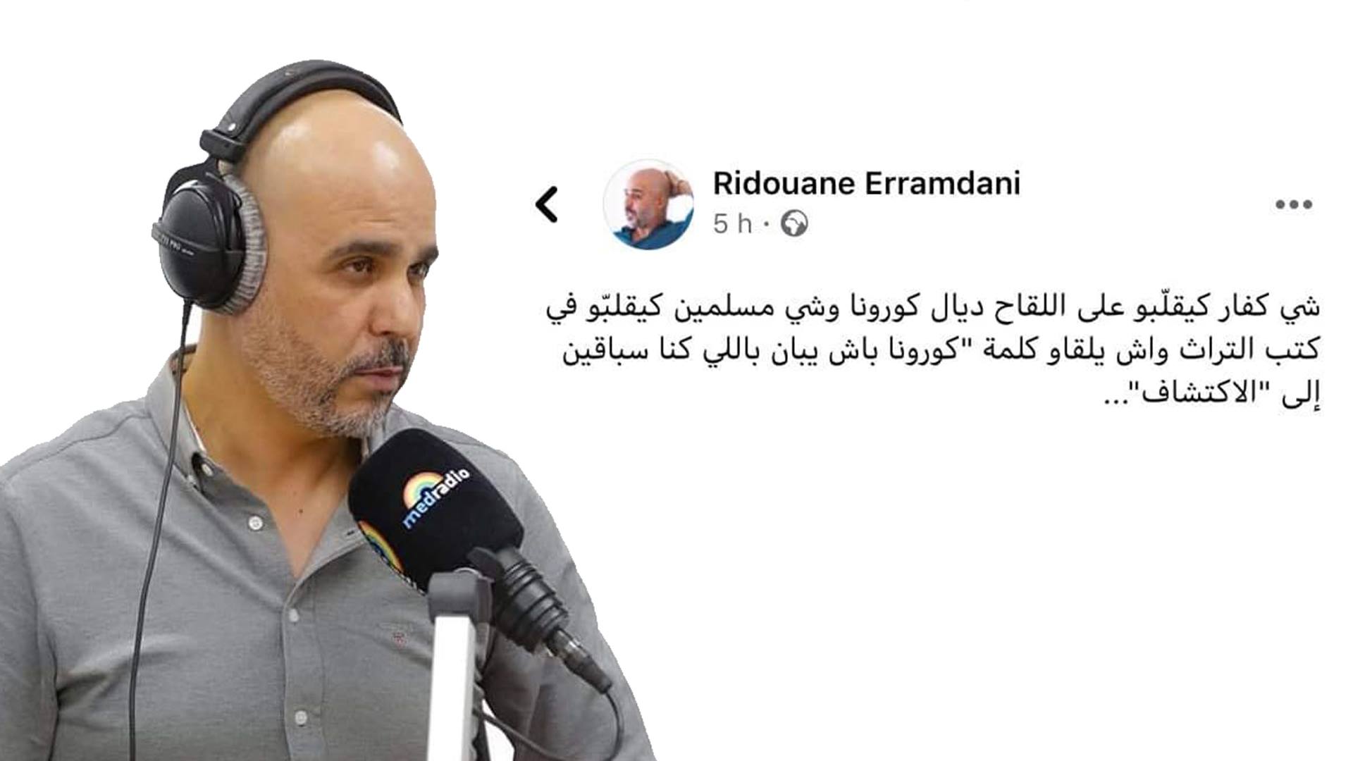التدوينة ربط فيها منشط برنامج “بدون لغة خشب” بين المسلمين والكفار وكورونا، وقال فيها “شي كفار تيقلبو على اللقاح ديال كورونا وشي مسلمين كيقلبو فكتب التراث واش يلقاو كلمة “كورونا باش يبان باللي كنا سباقين إلى الاكتشاف”…
