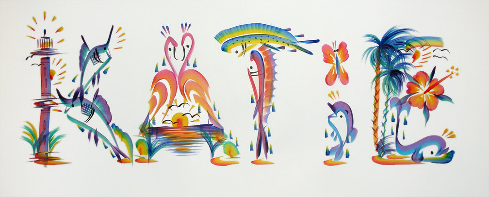 نفس فكرة الأسم السابق ، ولكن اعتمد المصمم على الرسوم النباتية ، أكثر من الرسوم الحيوانية ، من زهور ونخيل ، لإطفاء الجانب المشرق على زخرفة الإسم ، ولجذب انتباه كل من يراه.