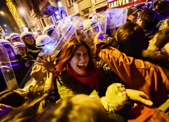 وعمدت شرطة مكافحة الشغب إلى تفريق الحشود في ساحة تقسيم قرب جادة الاستقلال حيث كان من المقرر تنظيم المسيرة، وفق ما أفاد مراسل وكالة فرانس برس.