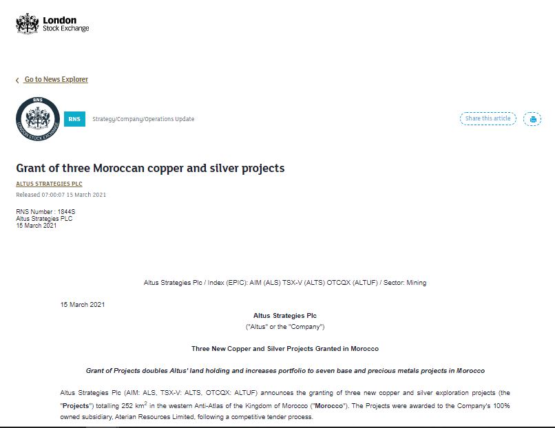أعلنت شركة “Altus Strategies” البريطانية للاستثمارات التعدينية، أنها حصلت على مشاريع جديدة للتنقيب عن النحاس والفضة في المغرب، تبلغ مساحتها 252 كيلومترًا مربعًا غرب الأطلس الصغير، مضيفة أن فرعها Aterian Resources Limited، حصل على الصفقة بعد فوزه بطلب عروض.