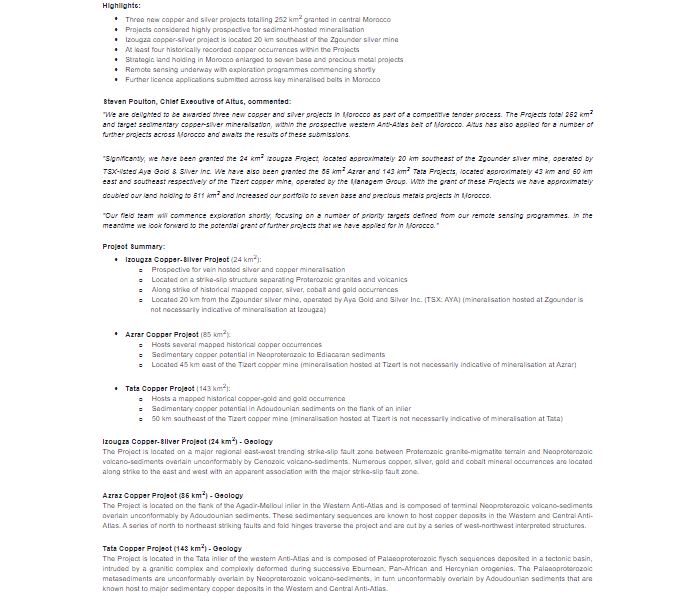 وجاء في بلاغ الشركة، توصل به موقع “هوية بريس”، أنها حصلت في مشروع أزكزا، بمساحة 24 كيلومتر مربع، الواقع على بعد حوالي 20 كيلومترًا جنوب شرق منجم الفضة زكوندر ، الذي تديره شركة شركة “مايا غولد أند سيلفر” الكندية ، كما حصلت أيضًا، وفق البلاغ:” على مشروعي أزرار (58 كلم مربع) وطاطا (143 كلم مربع) ، وتقع على التوالي على بعد حوالي 43 كيلومترًا و 50 كيلومترًا إلى الشرق والجنوب الشرقي من منجم النحاس تيزرت، الذي تديره مجموعة مناجم.