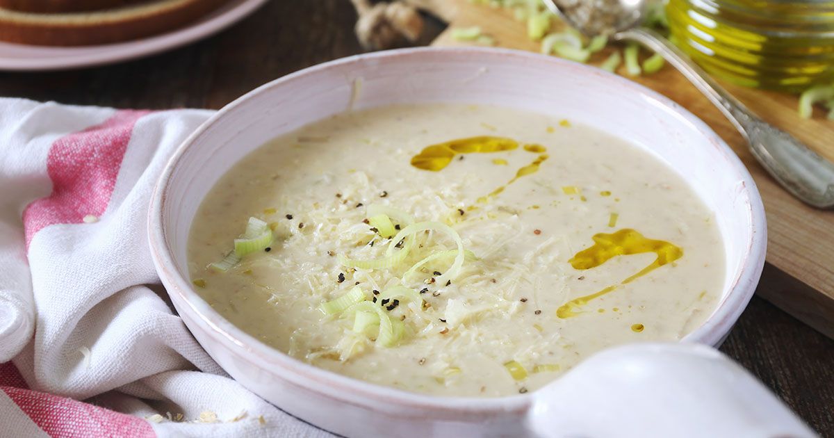 5- وزّعي الشوربة في أطباق التقديم. أضيفي الكراث والزبدة على الوجه. قدّمي الشوربة ساخنة. ألف صحة!