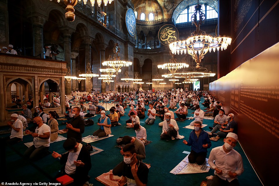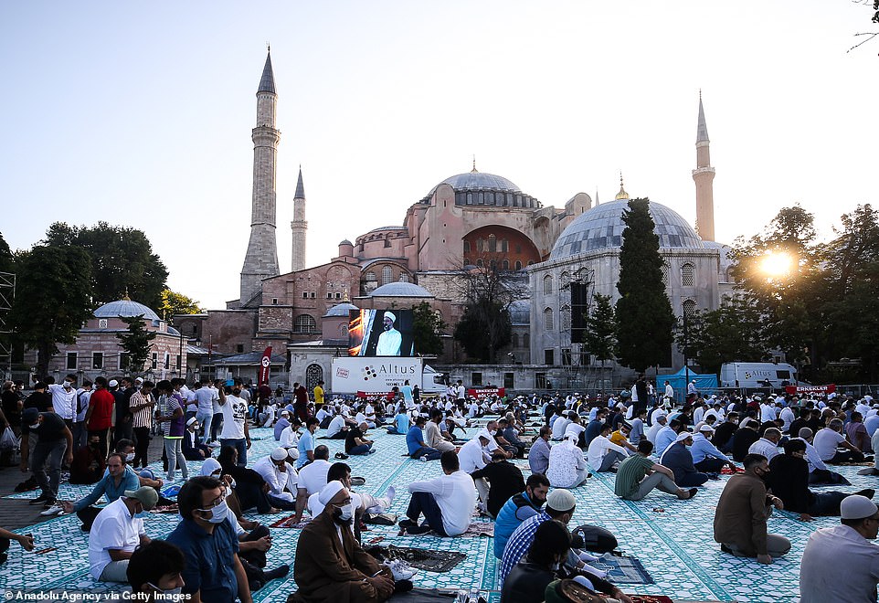 ISTANBUL, TURKEY: Muslims pray outside the Hagia Sophia, which was recently converted back into a mosque in a controversial move signed off by Turkey's president Recep Tayyip Erdogan