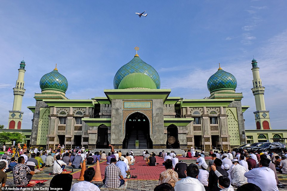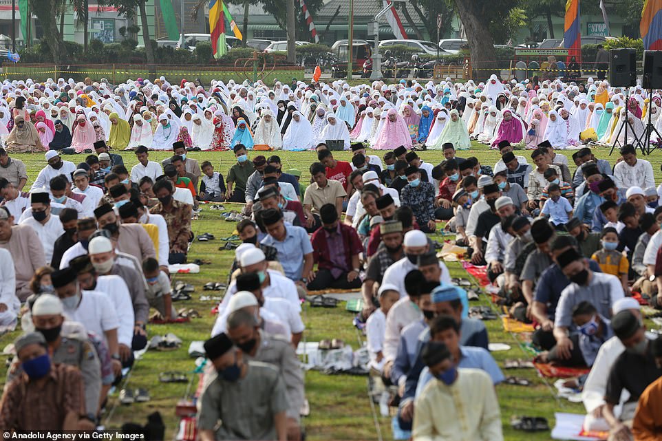 MEDAN, INDONESIA: People wearing masks and prayer caps attend prayers at Merdeka Square in Binjai this morning