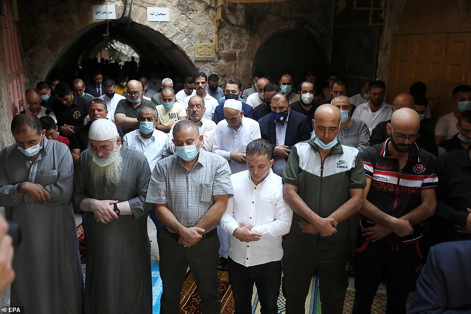 Palestinians Muslims offer Eid al-Adha prayers, in the West Bank city of Nablus, Friday, July 31, 2020. Eid al-Adha, or Feast of Sacrifice, Islam's most important holiday marks the willingness of the Prophet Ibrahim to sacrifice his son. (AP Photo/Majdi Mohammed)