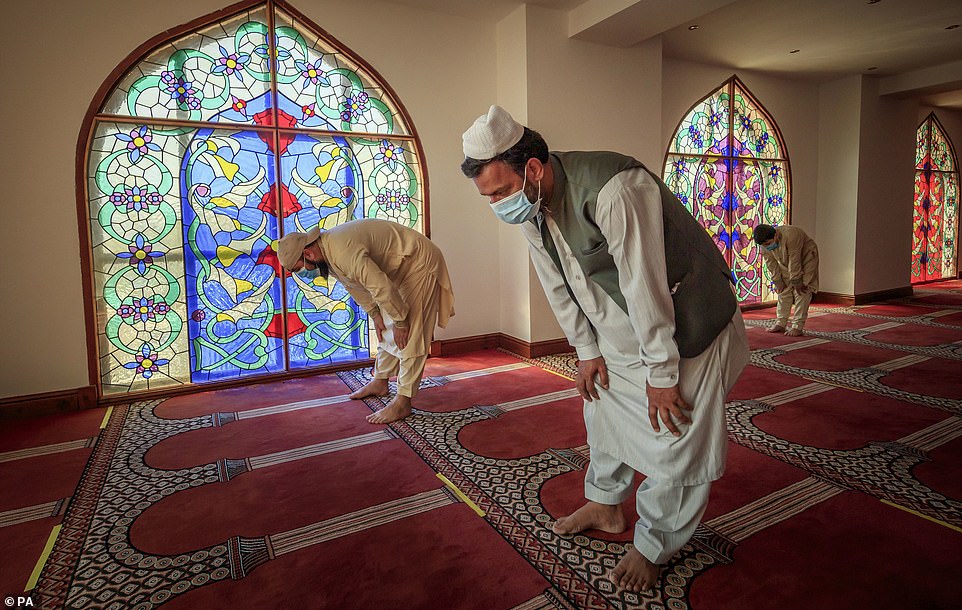 BRADFORD, UNITED KINGDOM: Worshippers pray in the North of England where there was fury today at the Government's abrupt decision to impose new restrictive measures in an area where many Muslims live