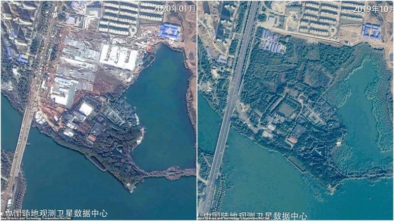 والتقطت الصور التي نشرتها شركة علوم وتكنولوجيا الطيران الصينية، الأحد، التغيرات الهائلة في المشهد الجغرافي، قبل وبعد بناء مستشفى “هوشن شان”، وسط مدينة ووهان.