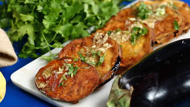 3- نقلي قطع الباذنجان البانيه في قدر من الزيت الغزير الحامي.