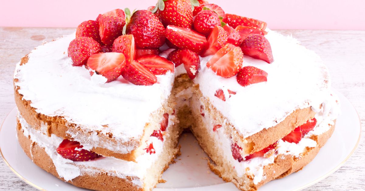 8- اقسمي التورتة الى نصفين بواسطة سكين وادهني الطبقة السفلية بطبقة سميكة من الكريمة، وزّعي عيها القليل من حبات الفراولة وضعي فوقها الطبقة الثانية من التورتة.