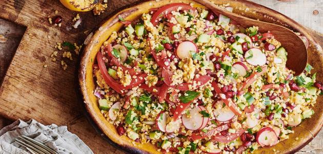 - توضع الخضروات السابقة في وعاء عميق، ويُضاف إليها البقدونس والنعناع، وتُخلط مع بعضها البعض.