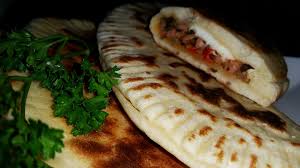 3. نقسم العجينة الى كويرات ثم تطلق بواسطة الدلاك وتعمل الحشوة في الطرف وفوقها شريحة الجبن، وتغطى بالطرف الاخر و تغلق.