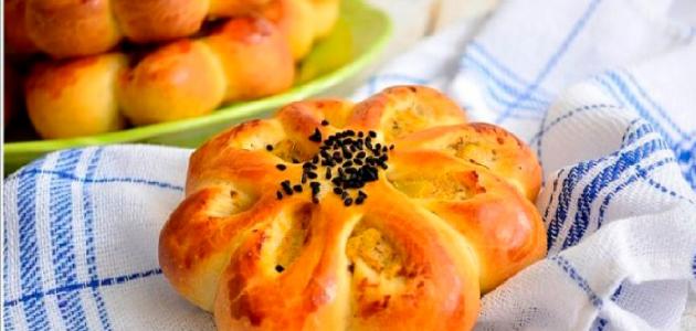 - تُدهن كرات العجين بالزيت ثم تُنّقل لصينية الخبز، ثم يُضغط عليها جيدًا حتى تصبح مسطحة الشكل، ثم تُشقق أطرافها باستعمال سكين ليصبح شكلها كالوردة أو بأمكان السيدة أن تقوم بعمل أيّ شكل آخر ترغبه.