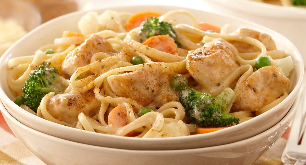 9- نوزّع المعكرونة في أطباق التقديم ونضع الدجاج على الوجه.