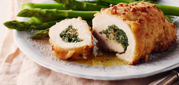 - تُوضع صدور الدجاج بين طبقتين من النايلون وتُدق حتى تصبح رقيقة، ويتم تتبيلها بالملح والفلفل، وبعدها توضع الحشوة وتُلف القطع بإحكام لمنع خروج الحشوة منها.