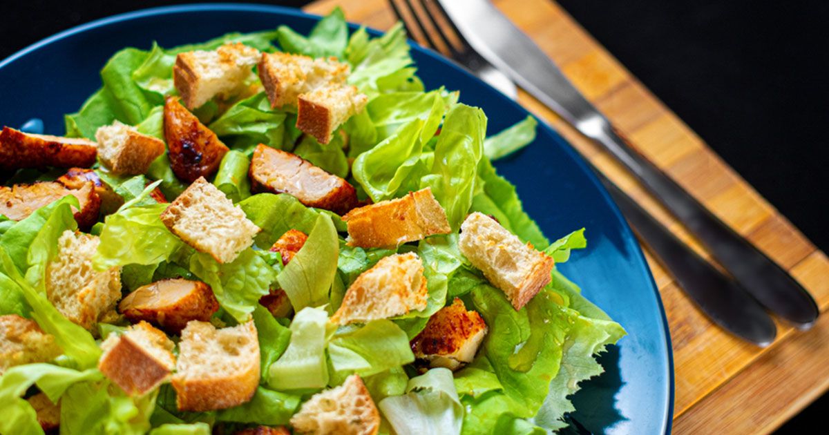 5- في وعاء التقديم، ضعي الخسّ، البصل، الكروتون وجبن البارميزان.