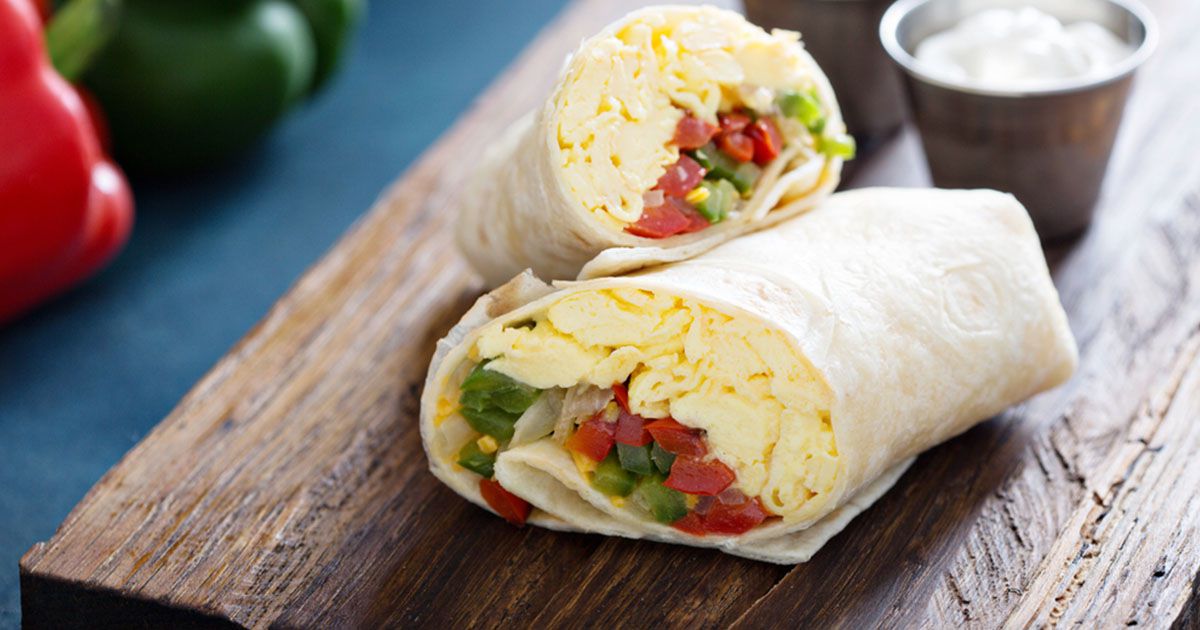 4- إفردي شرائح خبز التورتيلا على سطح العمل. وزّعي البيض على خبز التورتيلا ثمّ أضيفي مزيج الخضار. لفّي الخبز على شكل رول وقدّميه. ألف صحة!