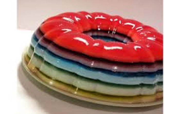 4. نكرر العملية للكمية المتبقية من الجيلي، ثم نترك طبقات الجيلي حتى تبرد تماماً ثم نضعها في الثلاجة لمدة نصف ساعة، وبعد التأكد من تماسكها جيداً نقوم بقلب القالب وإخراج طبقات حلوى الجيلي ونزينيها بالكريمة ونقدمها باردة .