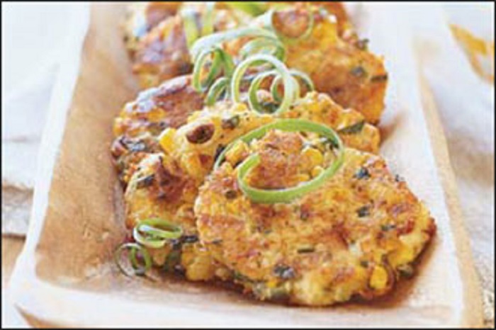 - في وعاء عميق، نضع كل من الذرة والدقيق والبيض والثوم والبصل ونقلب المقادير جيداً.