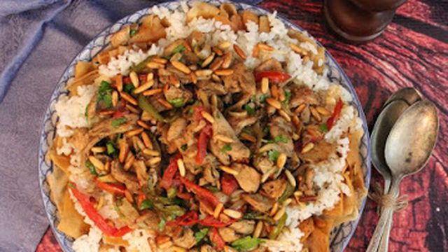 - في طبق تقديم عميق، نرص الخبز ونشربه بالشوربة، ثم نرص الأرز وأخيراً نضع خليط الشاورما .