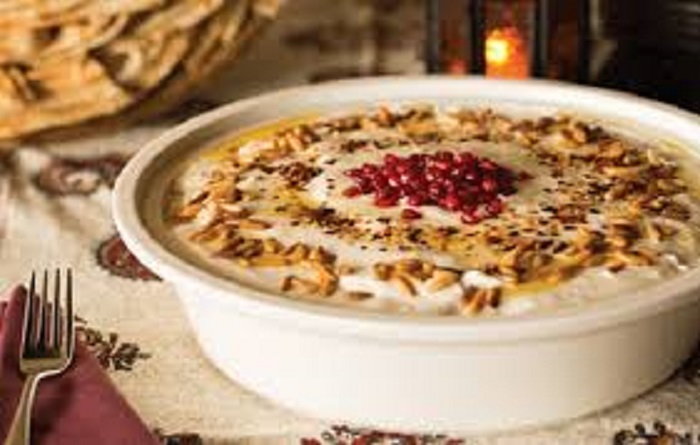 - أخيراً نرش حبات الصنوبرالمحمص و حبات الرمان على وجه الصحن للتزيين .