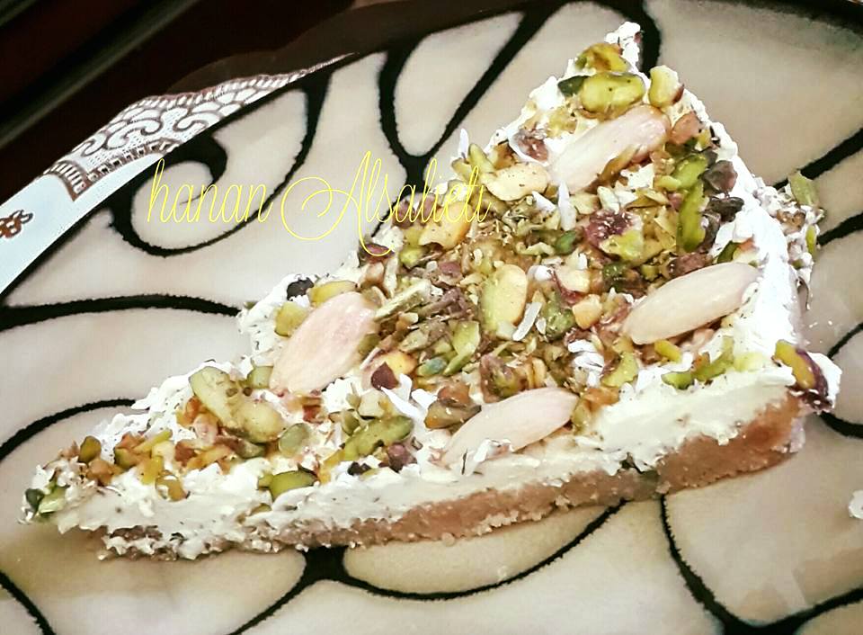 في طنجره منحط الزبده ومنذوبها ومنضيف عليه السميد طبعا مع التحريك المستمر حتى ما يكتل الخليط لحتى يصير لونه اشقر ومنرجع منضيف السكر وماء الورد وماء الزهر ومنحركهم مع بعض كويس اخر شي منضيف الحليب السائل ومنضلنا نحرك فيهم لحتى يتقل الخليط ومنحطهم في قالب الشيز كيك ومنخليه ليبرد ومنضيف عليه 3 علب او 3 باكيت قشطه قيمر ومنفردهم كويس ومنزينها اول شي بجوز الهند وبعدين بالفسدق الحلبي واللوز المحمص