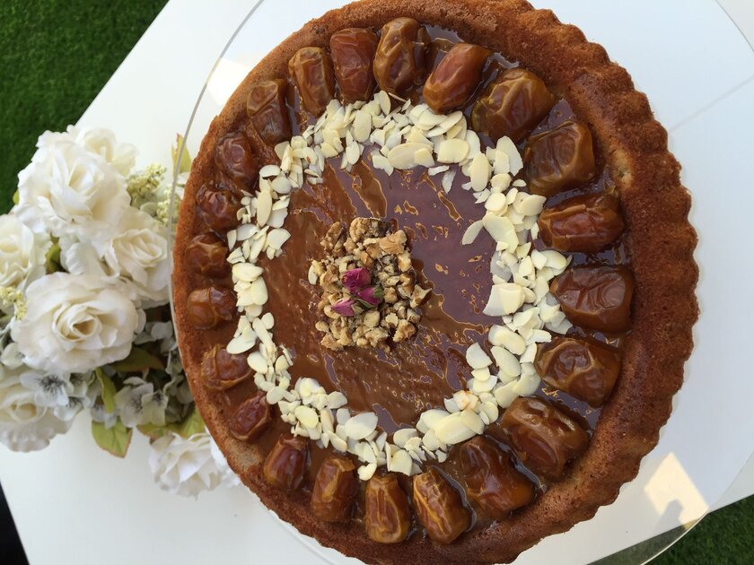 تخرج من الفرن ثم يذوب التمر بوضعه في الميكرويف لمدة 30 ثانية ويوضع على التارت .