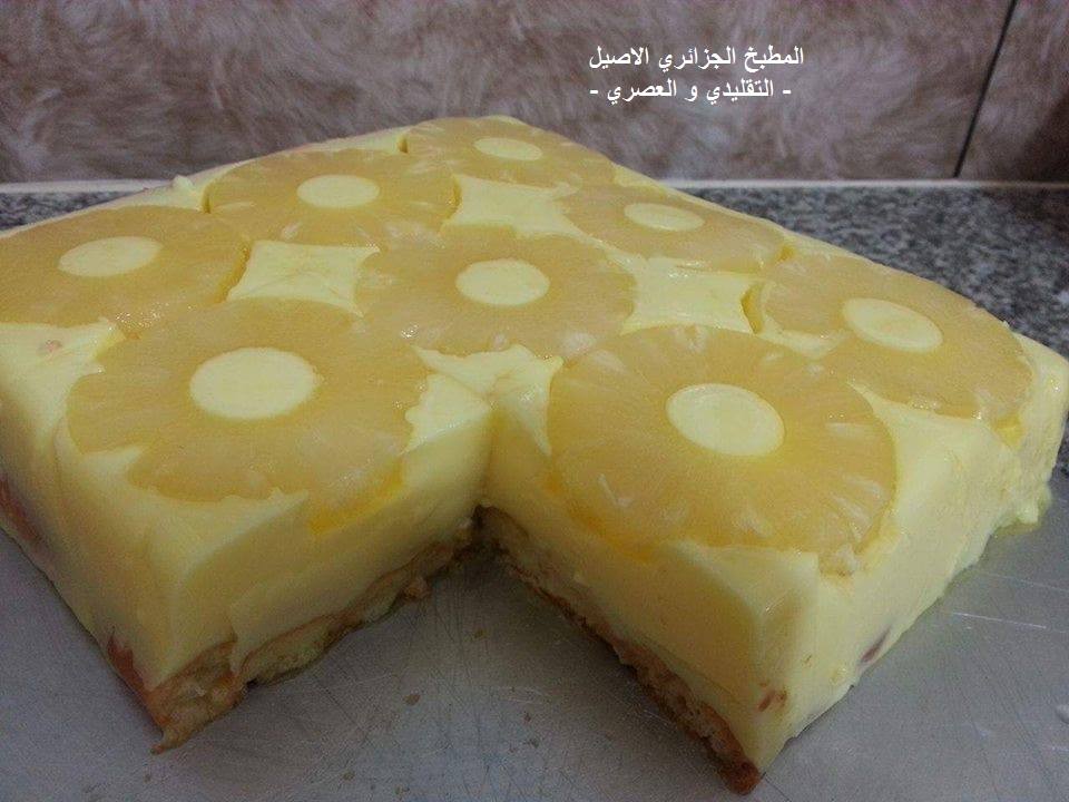 في هذه الاثناء ناخذ مول زجاجي او اي مول عندك نغلفه بالبلاستيك الغذائي ثم نصطف فيه الاناناس ثم نغطس البودوار في عصير الاناناس و نحطوها في المول فوق الاناناس كيما في الصورة و من بعد نفرغ عليها خليط الفلان بعد ما يبرد تماما